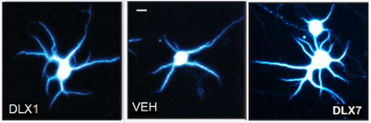 Image from Delix Therapeutics PreClinical Studies showing architecture of neurons treated with DLX-1, control (VEH) middle and DLX-7 showing neurogenesis; spinogenesis and dendritogenesis (growth of neuronal projections) associated with antidepressant effects.